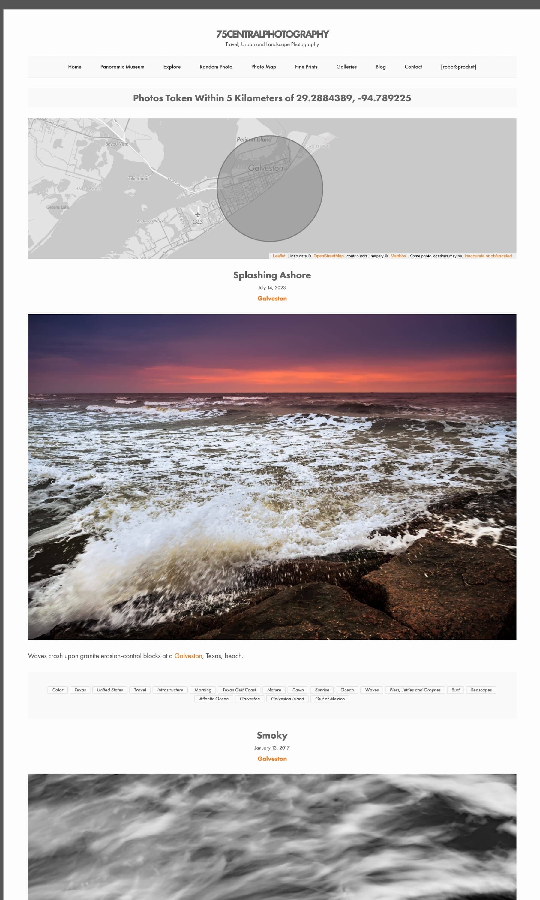 For a while now, we have displayed geolocation information on every photo on 75CentralPhotography, as can be seen by the map and related geographic information below the photo you're viewing: