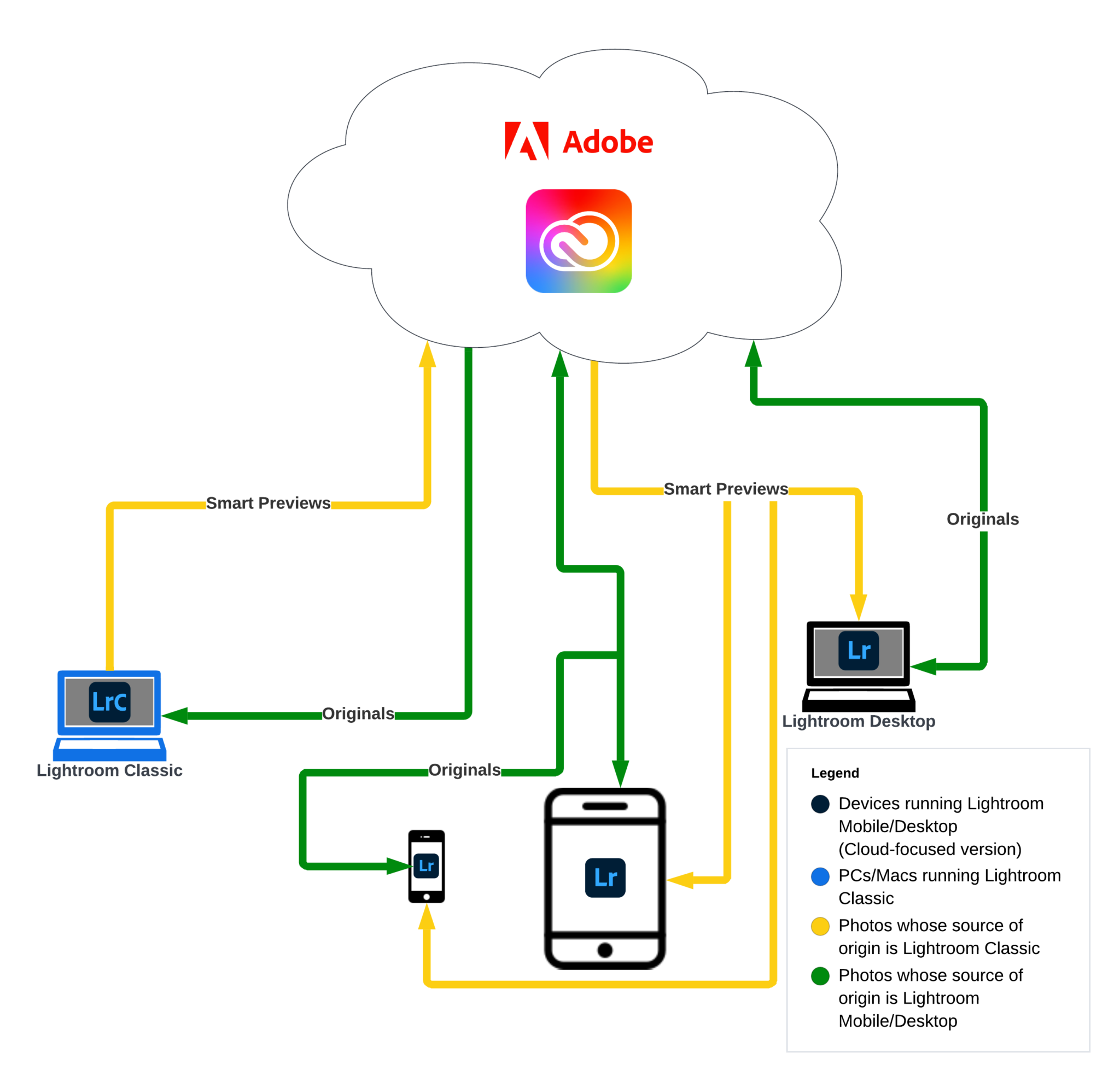 - Photos ingested into the Lightroom ecosystem via LrC on your PC or Mac behave a little differently in that only Smart Previews (which are reduced-resolution copies of the photos in the DNG (Digital Negative) format are synced to the cloud. And these photos are only synced if you add them to a collection in LrC that is enabled for syncing. Thus, only these smart previews are synced to your instances of Lr, which is fine for editing (as edits are synced across the ecosystem) or for lower-resolution exports for use in non-resolution-critical instances, such as posting to Instagram. The benefit here is that these Smart Previews do not count against your consumed storage on Adobe Cloud, so no worries about running out of space or incurring overage charges.