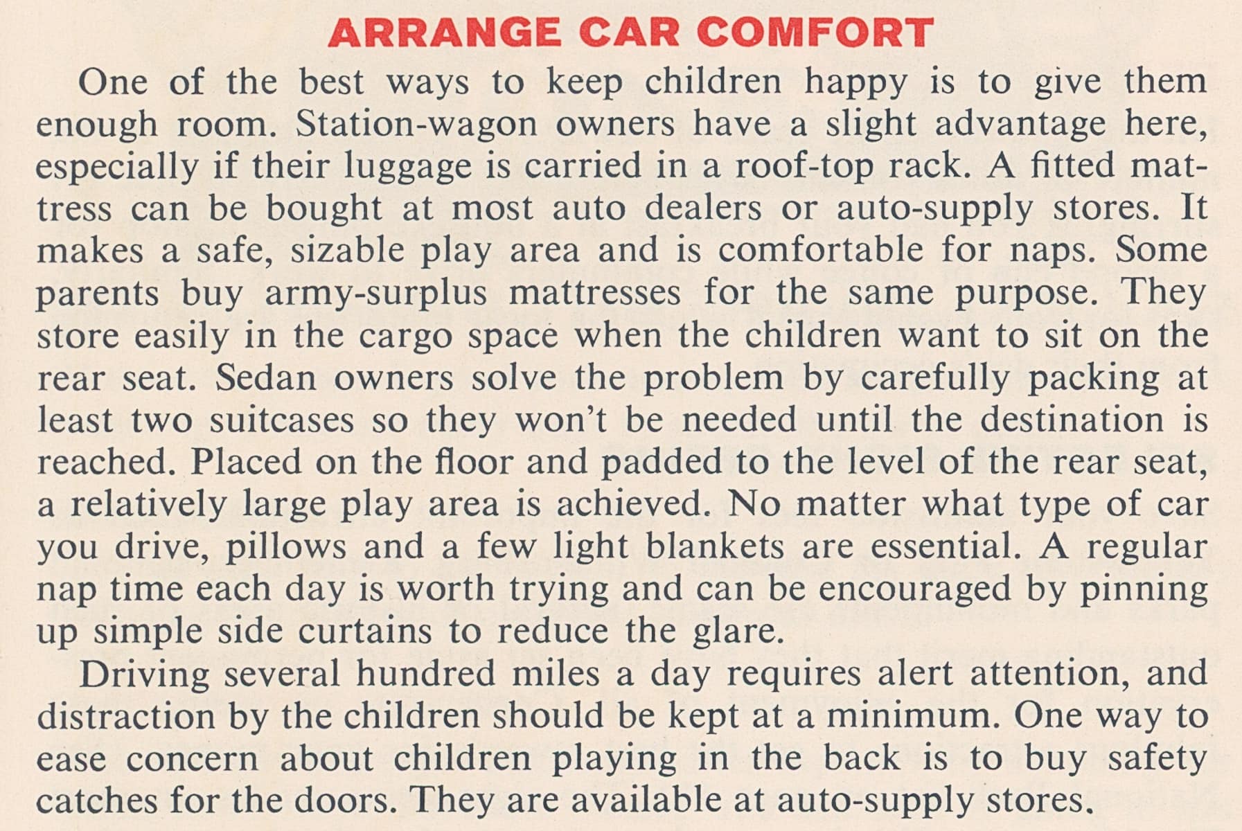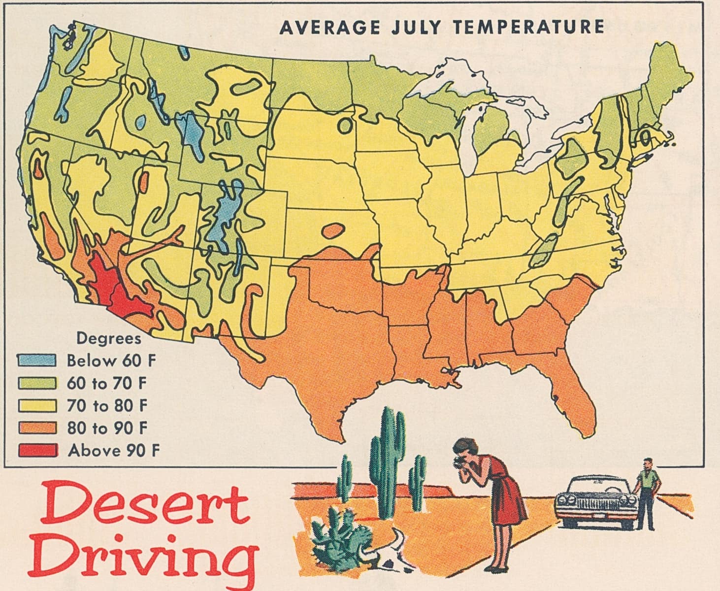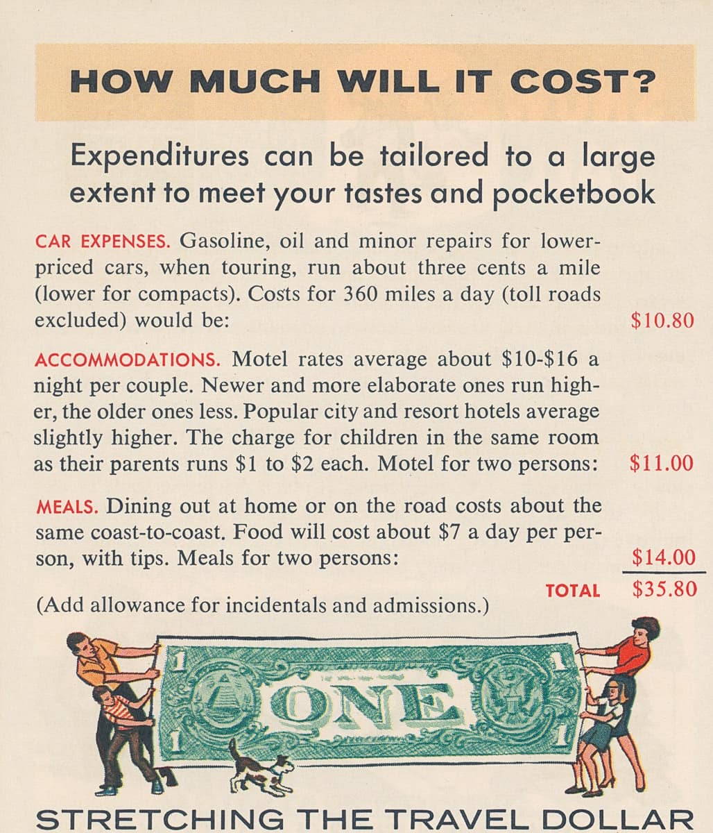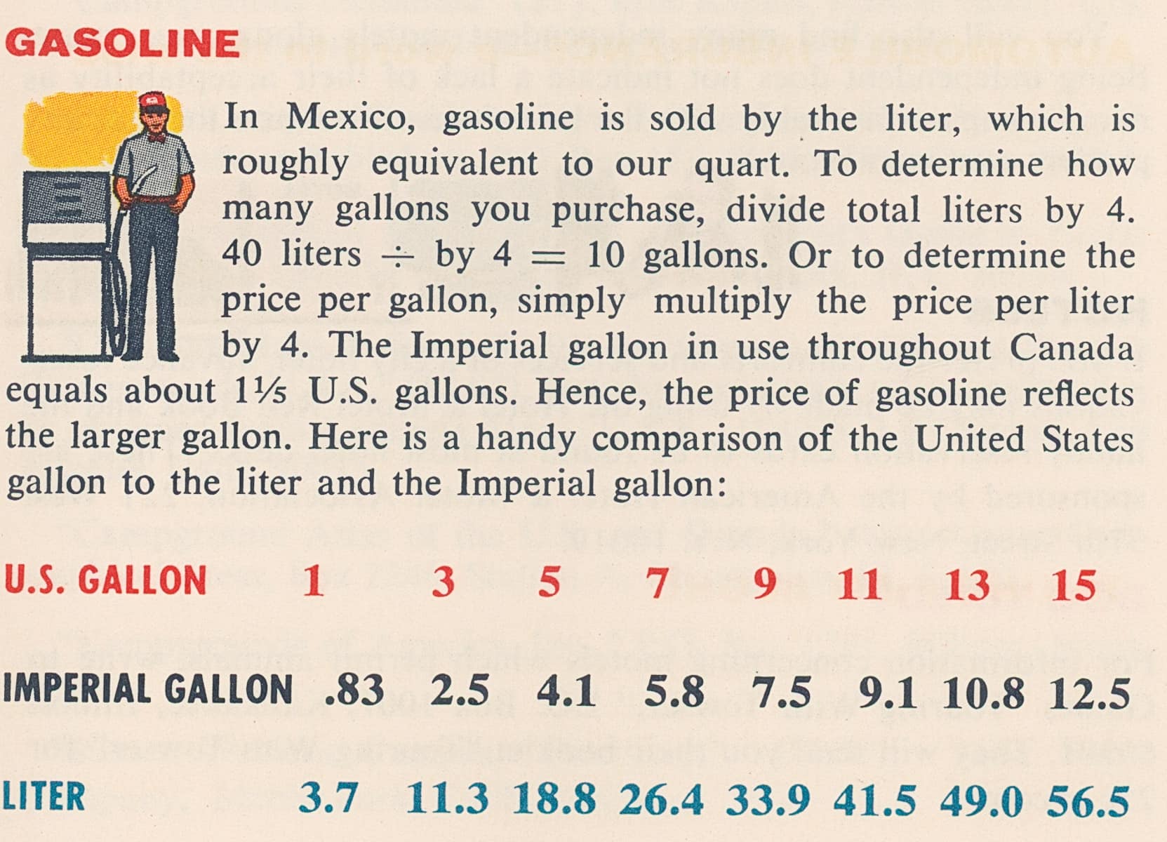 Nothing like going on vacation and touring factories! (Though I'd probably enjoy it, once again to my wife's chagrin)."...completion by 1972"This seems like too much math for me to do while planning a vacationAs a resident of Texas, I can assure you that global warming has ensured there'd be some red on this map if it were from this century"Smile son, for Old Sol is coming to take us to our eternal reward!"That's about $311 in 2022 money, which seems like you could do better than today (unless you stay in an AirBNB where the owner charges as much as the room for a "cleaning fee")If you have a station wagon, you can turn the rear into a dangerous playground for your kids!Were they just ignoring the fact that Hawaii also became a state in 1959 after Alaska and would thus be the newest state? Did they refuse to acknowledge it because you can't get there by car?Canada hadn't bought into that whole "metric" thing yetCanada was still using Her Majesty's GallonsCanada didn't change to the metric system until 1975. The United States didn't change until never.