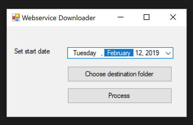 {"Image":"http://www.75centralphotography.com/wp-content/uploads/2018/12/las-vegas-bliss-dance-sculpture-hand.jpg","permalink":"http://www.75centralphotography.com/?post_type=post&p=38007"}Moving on to the Windows app part of the solution, I built a simple UI that would let me choose a start date, choose a folder to save the images to, and a button to actual start the process: