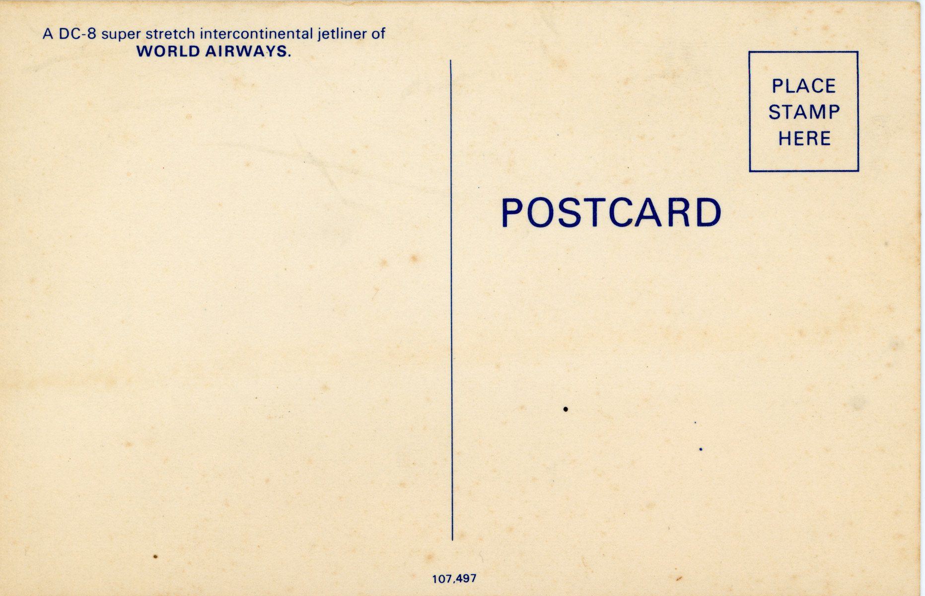 As to why this postcard was in their possession, I can only assume that they once flew World Airways and this was a freebie—my grandfather wasn't one to pass up on something free and would've taken it without intent to send it.