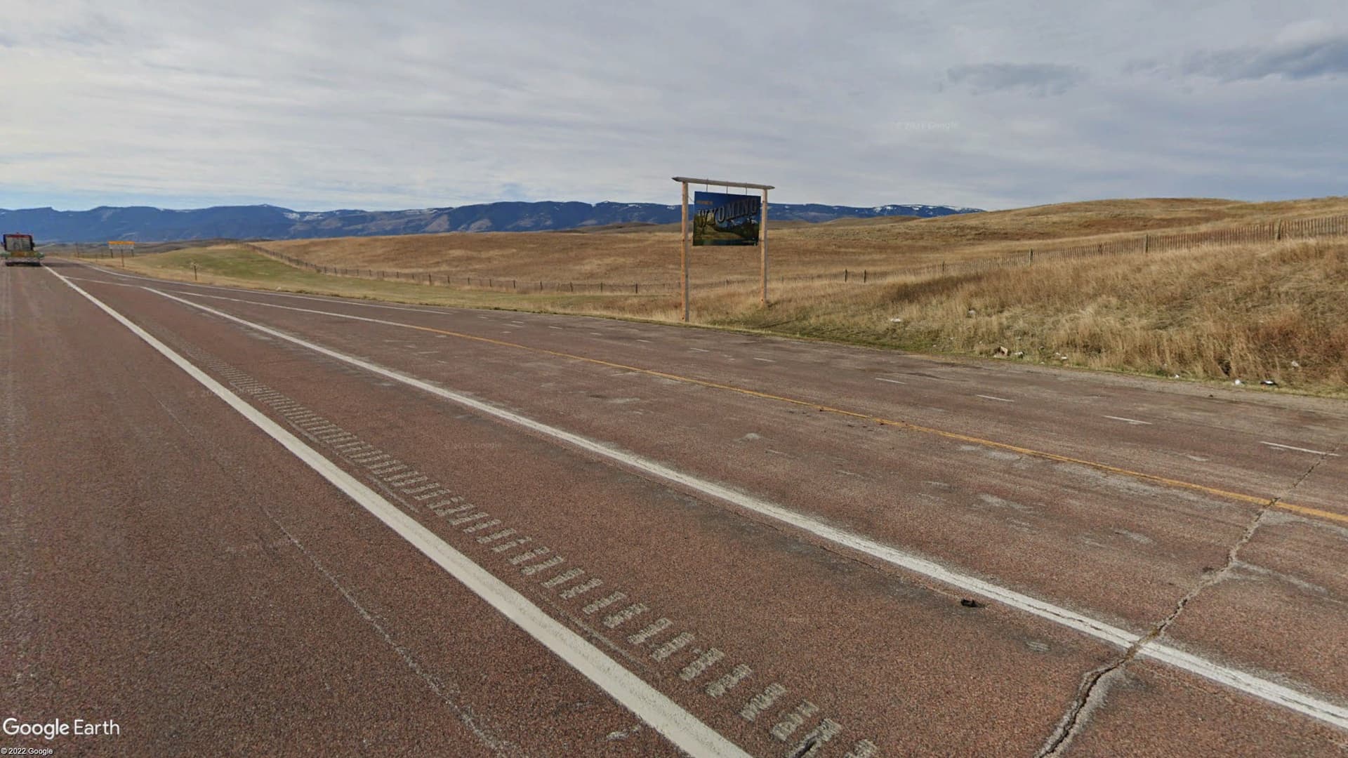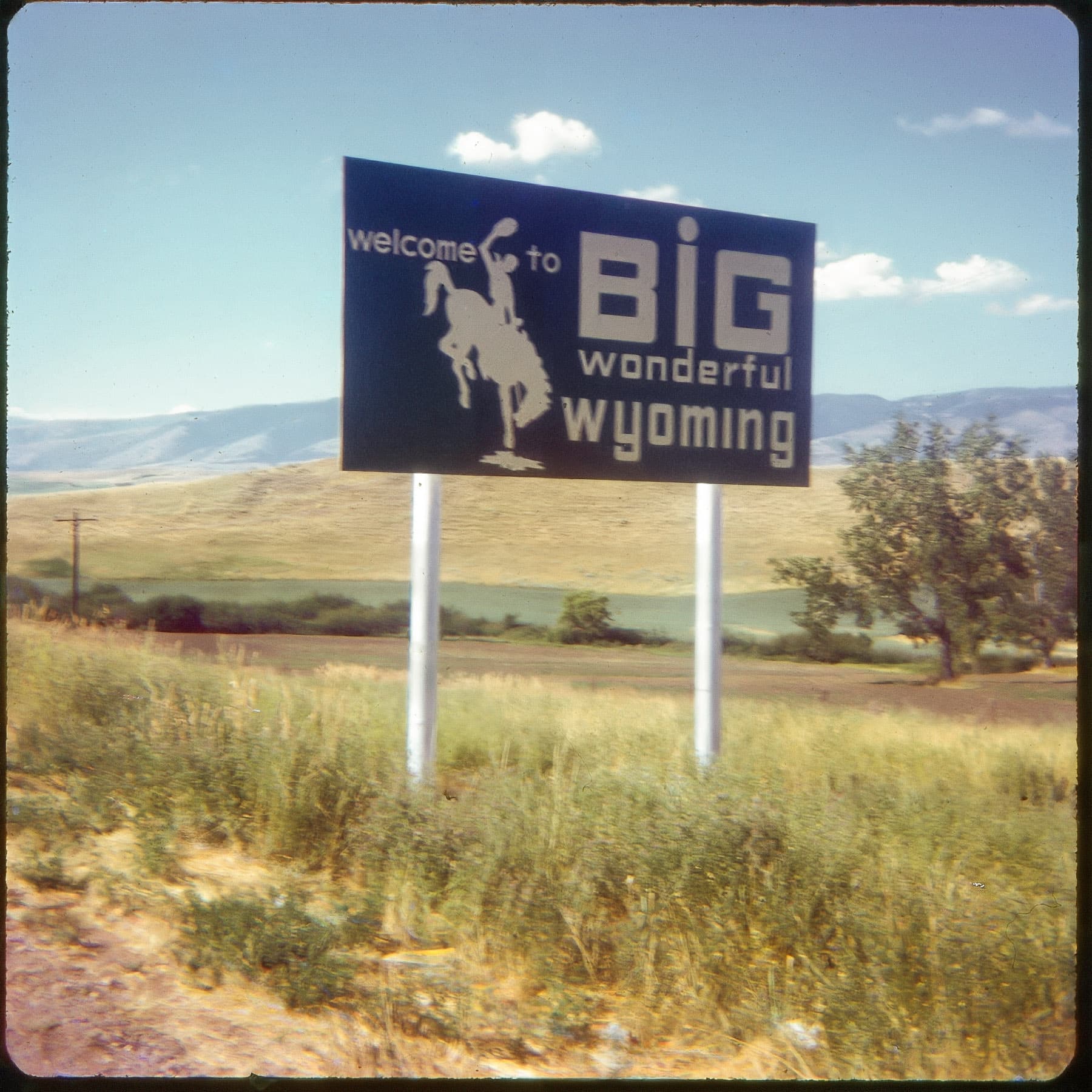 The environs here seem to nicely-match those of the modern Welcome to Wyoming sign along I-90/US-87 near Parkman as seen in this Google Streetview shot: