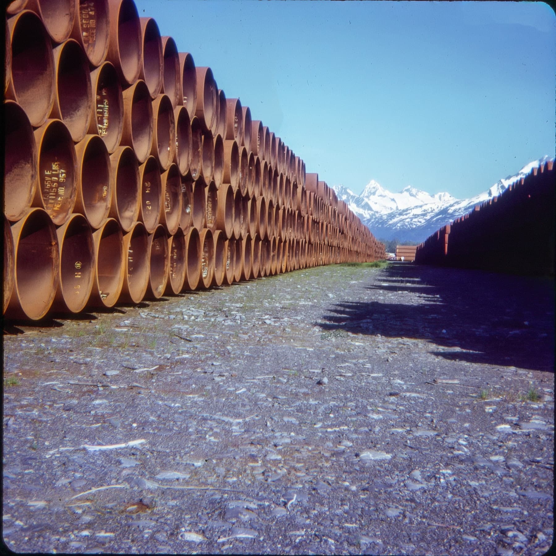 These are sections of pipe stacked in Valdez for construction of the Trans-Alaska Pipeline, which was built from 1974-77 from Valdez, which acted as a staging ground/port, to Prudhoe Bay in Northern Alaska. For my previously-stated timeline, I gave a leeway of two years prior, 1973, as being a lower-bound for dates as I wanted to give some leeway for construction preparation which, I assume, would include manufacturing the pipe in Japan and shipping it to Valdez, where it was offloaded and stored in preparation for construction.