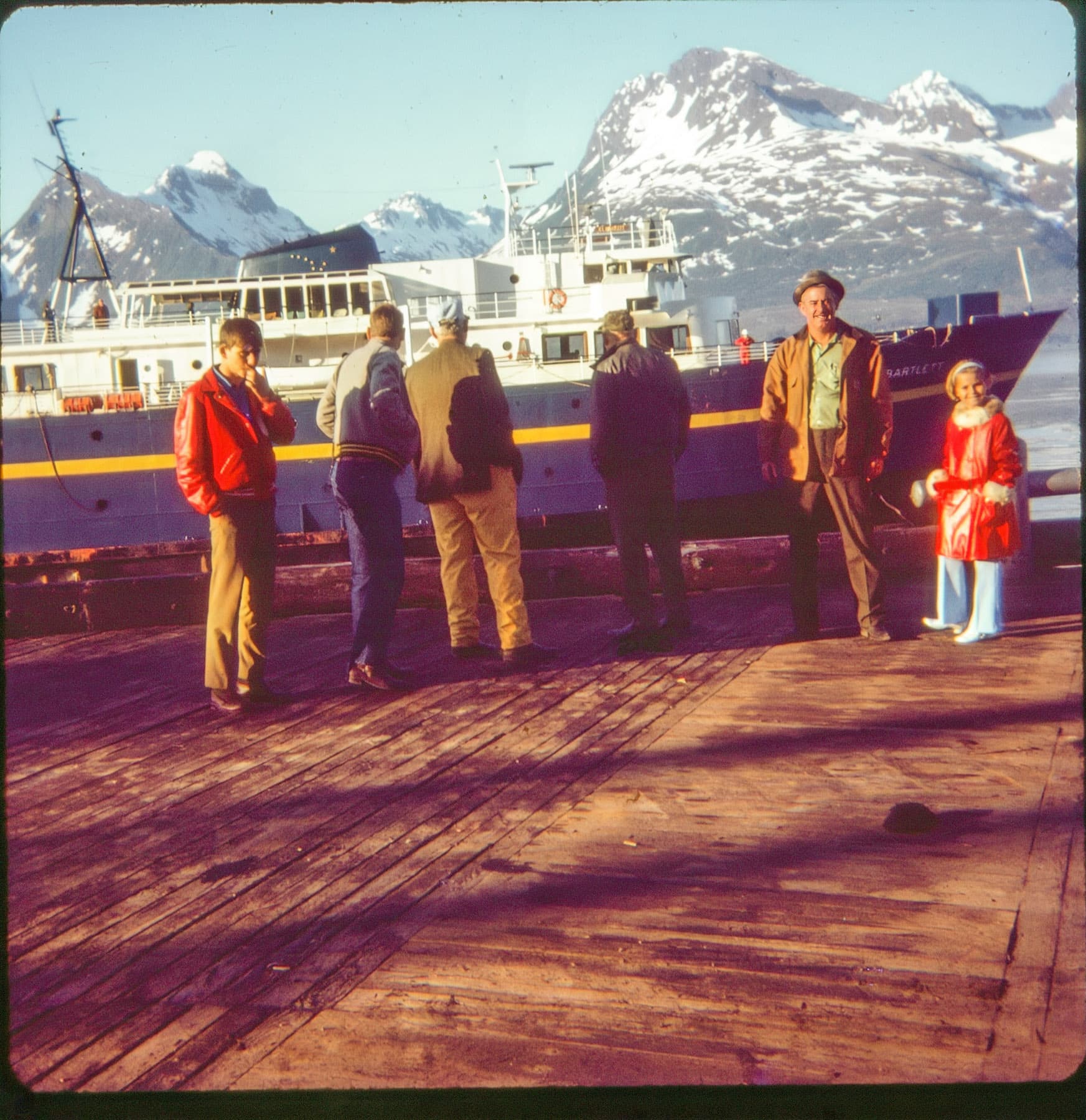 Looking closely at the bow, we can see that this is the M/V Bartlett. This makes sense, as the Bartlett served the Cordova-Valdez-Whittier route on Prince William Sound and we know that at some point they ended up in Whittier because of this photo: