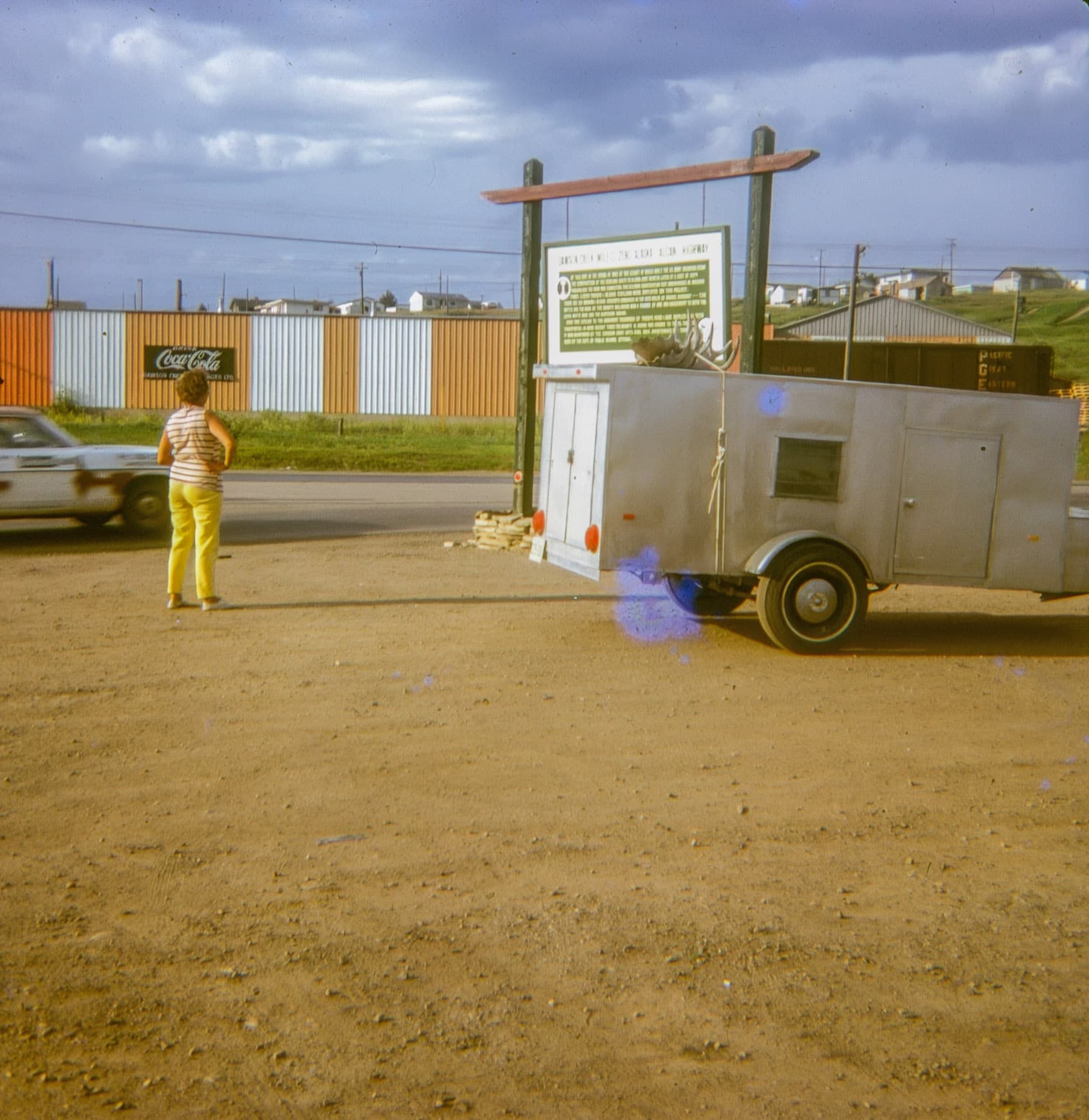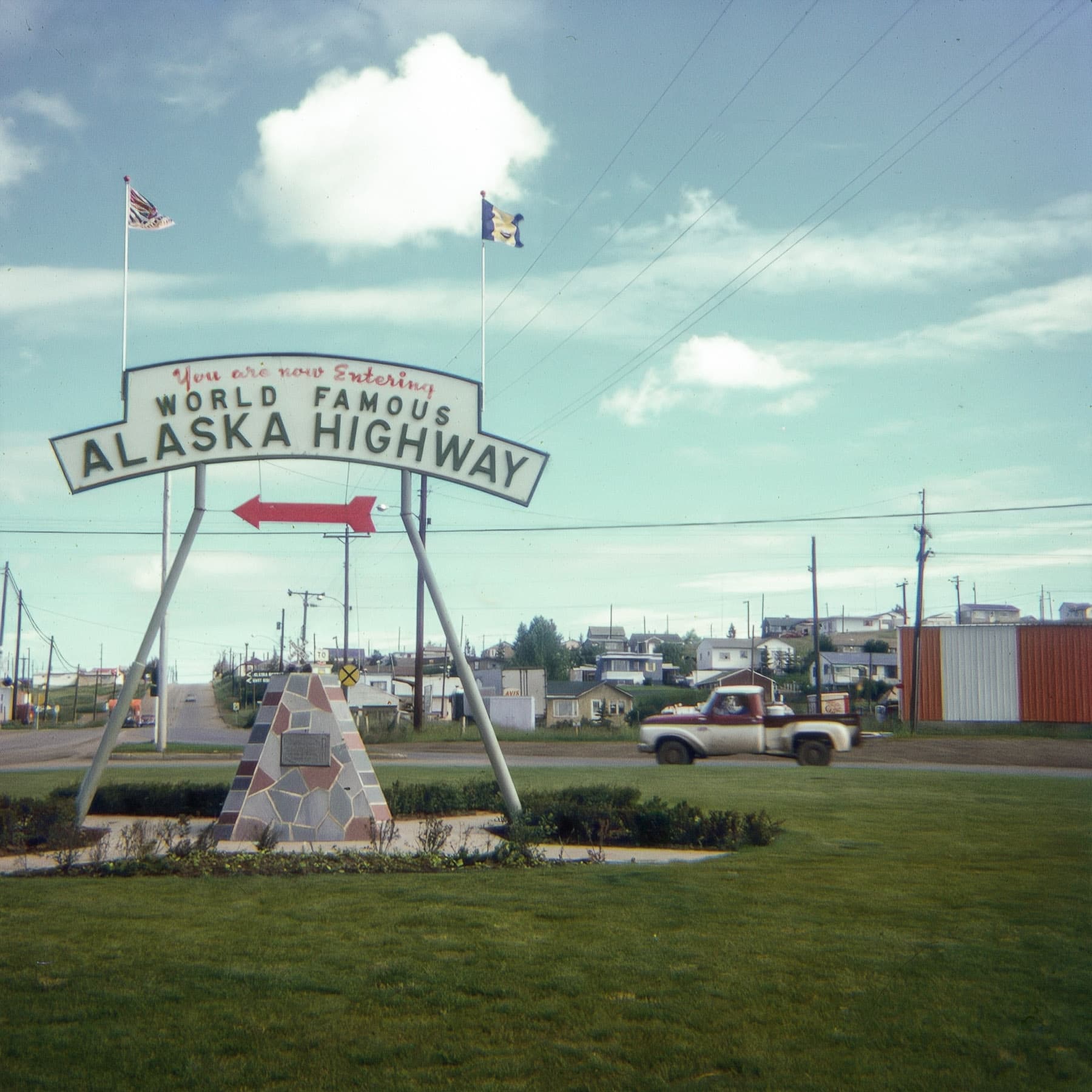 Next, we know that they did eventually make it to Dawson Creek[efn_note]Not to be confused with Dawson's Creek.[/efn_note], BC, as they helpfully took a photo of the starting point of the Alaska Highway (aka the Alcan Highway):