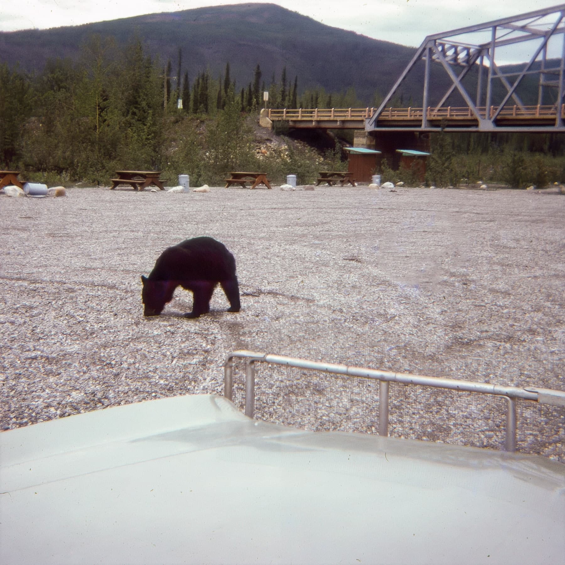 The next two photos are pure conjecture, but I believe that on the road between Dawson Creek and Whitehorse, they stopped at a roadside park near McClintock, YT, to stretch their legs and avoid angering this bear:
