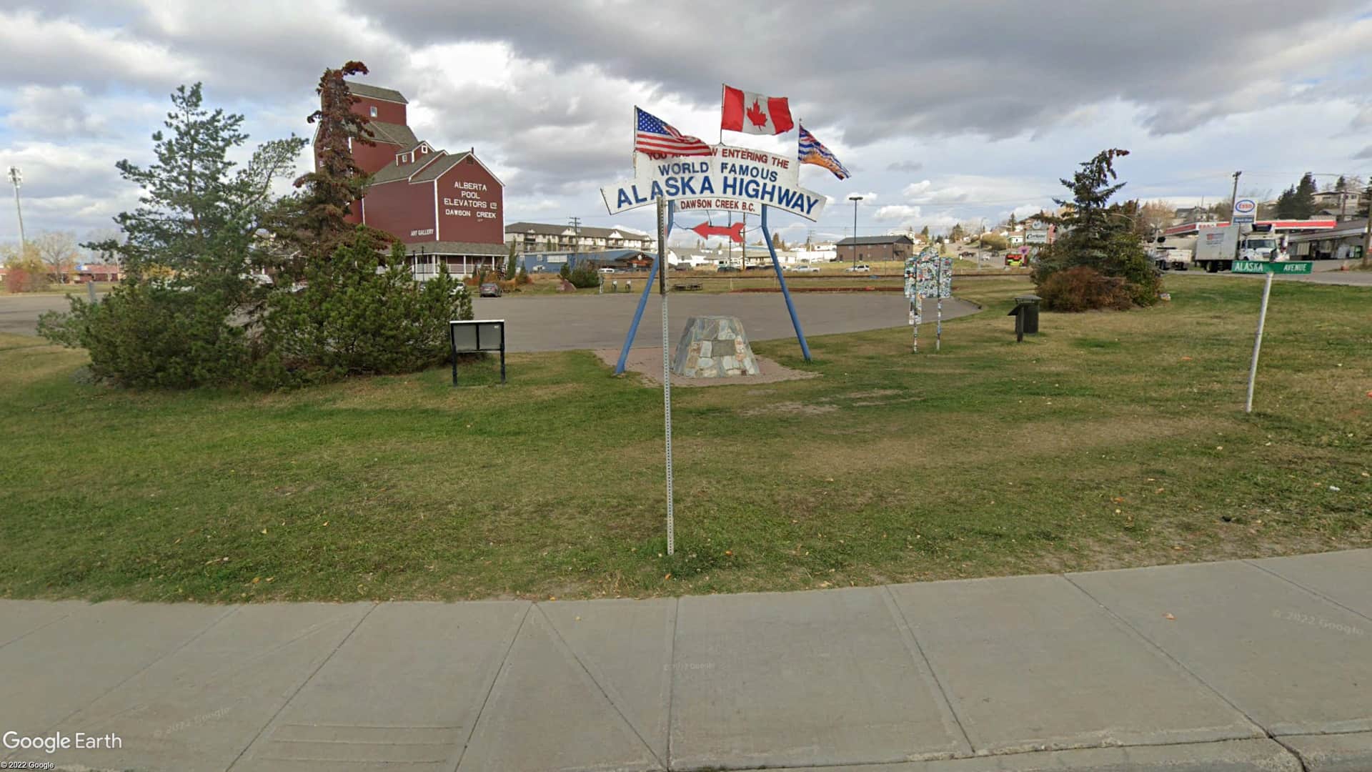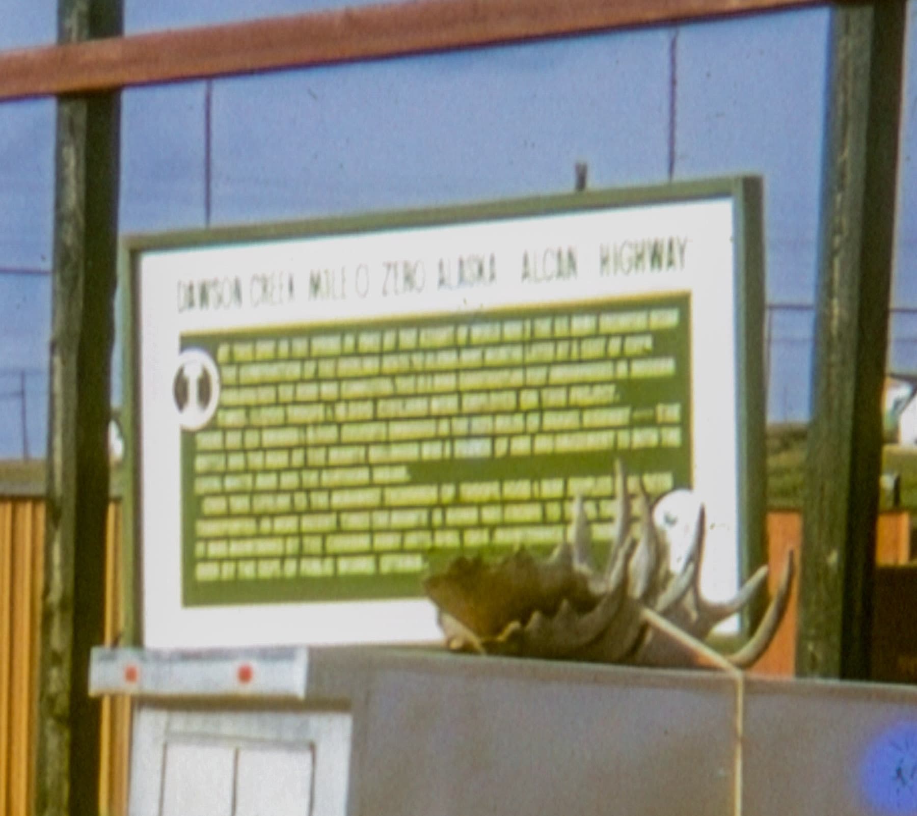 This next photo seems to be from the same vicinity, as zooming in on the sign reveals that it says "Dawson Creek Mile 0 Zero Alaska Alcan Highway":