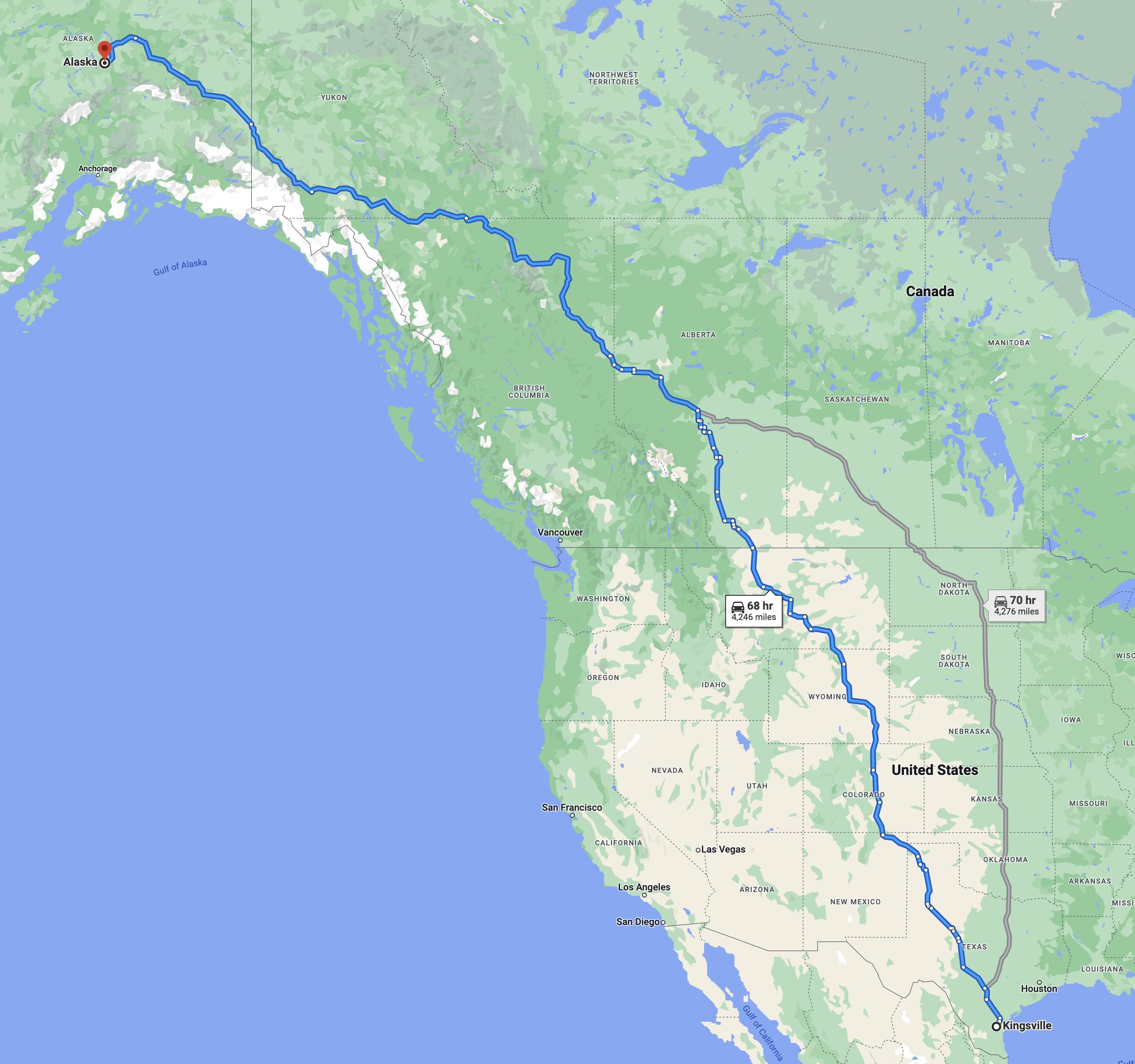 We know that they were living in Kingsville, Texas (home of the King Ranch, Reality Winner and not much else), at the time and that their ultimate destination was somewhere in the largest state, so that gives us couple of possible logical routes:
