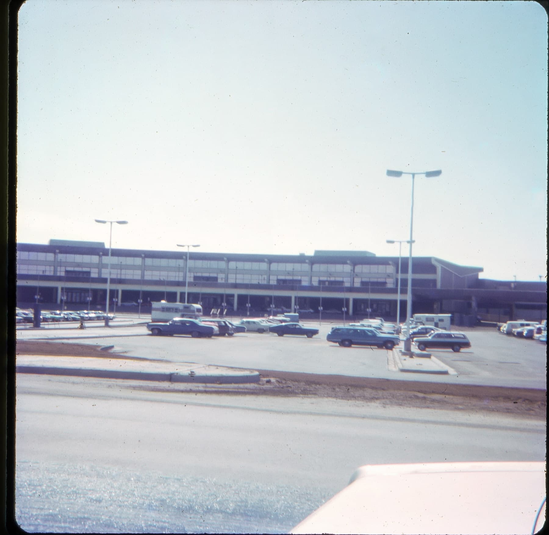 I was able to determine this by a) it looks like an airport terminal and b) comparing the rooflines of this old photo of the terminal: