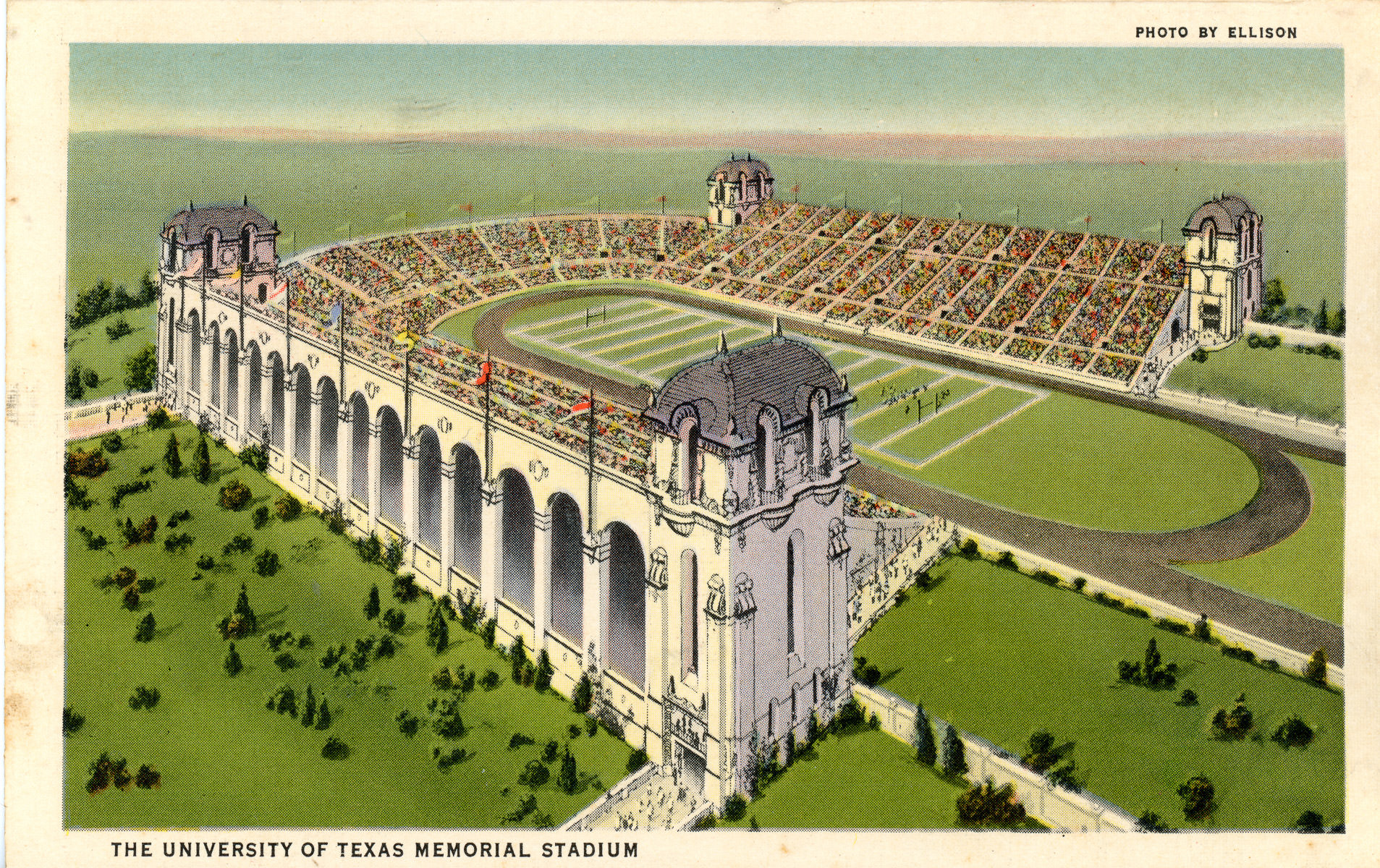 A while back, I shared that I'd found a souvenir set of postcards from late 1930s Austin, Texas, amongst my grandparents' cache o' stuff.One of the items in there was a postcard of the University of Texas' Memorial Stadium: