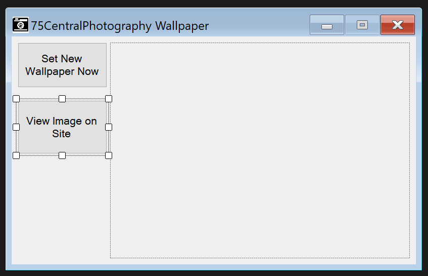 To start, I created a simple UI with a couple of buttons and a picture box. One button would let the user interactively set a new background by calling the above webservice's randomImage element and the second would use the permalink element to open the current wallpaper's page on 75CentralPhotography.com in the default browser. The picturebox would display the current wallpaper and was really just there for testing purposes (i.e. I needed to ensure I was retreiving the image properly before I wrote the code to set as the wallpaper).