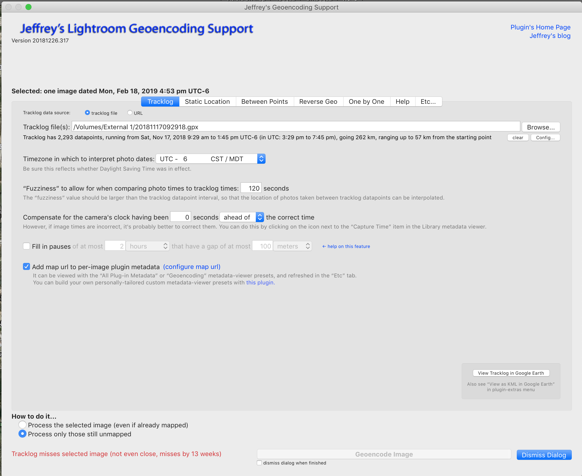 The next tool we need is a way to merge the location and time data in our .gpx file with our photo data. Since I'm an Adobe Lightroom user (Classic, none of that CC nonsense for me!), I could use Lightroom's rudimentary built-in geo-tagging feature (a tutorial can be found here), but I prefer some fine control over the process, so I use Jeffrey Friedl's excellent Geoencoding Support plugin (note that you may need to change the https to http in your URL bar to get that page to load, as Jeffrey doesn't do https for reasons).