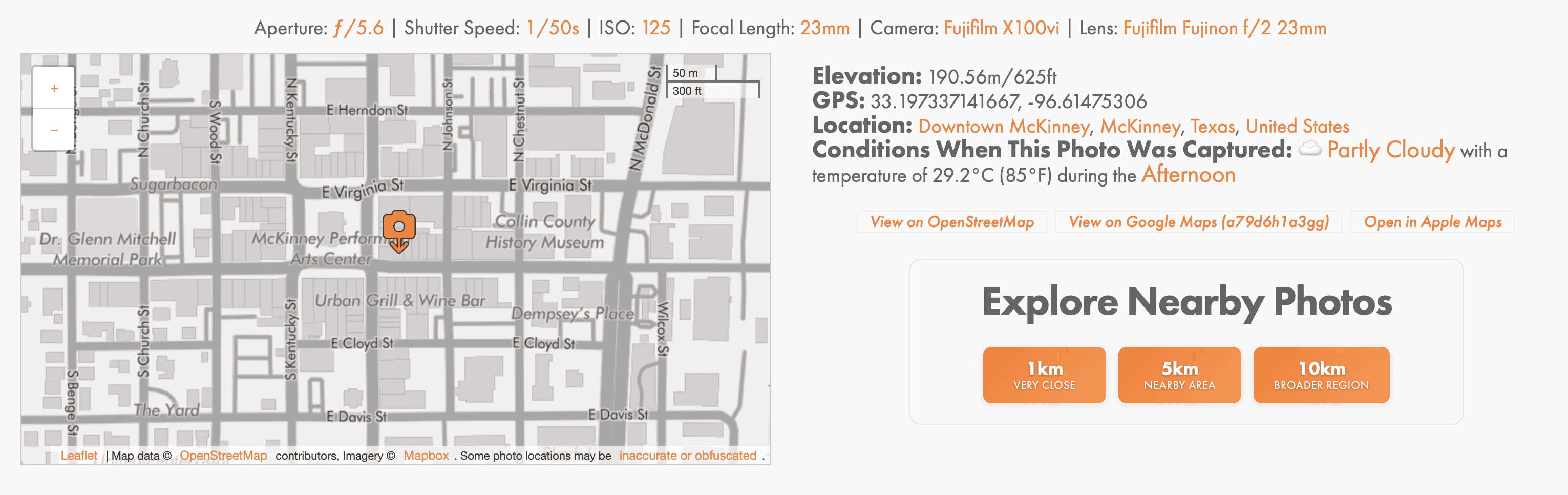 On 75CentralPhotography, in the spirit of transparency (as I previously touched-on here), we display the EXIF data, location and weather conditions for almost all of our photos of the day: