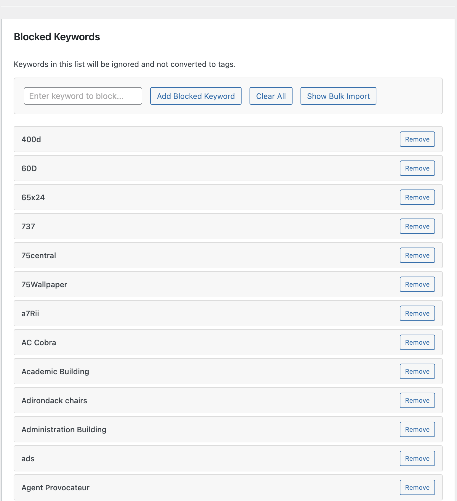 The plugin allows the user to define keywords to block (because there are keywords you might add to a photo in Lightroom Classic that aren't relevant to your site (perhaps SEO-related):